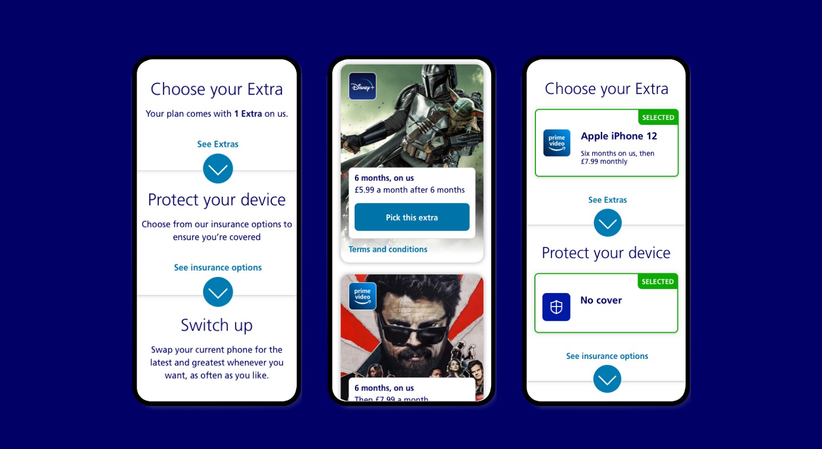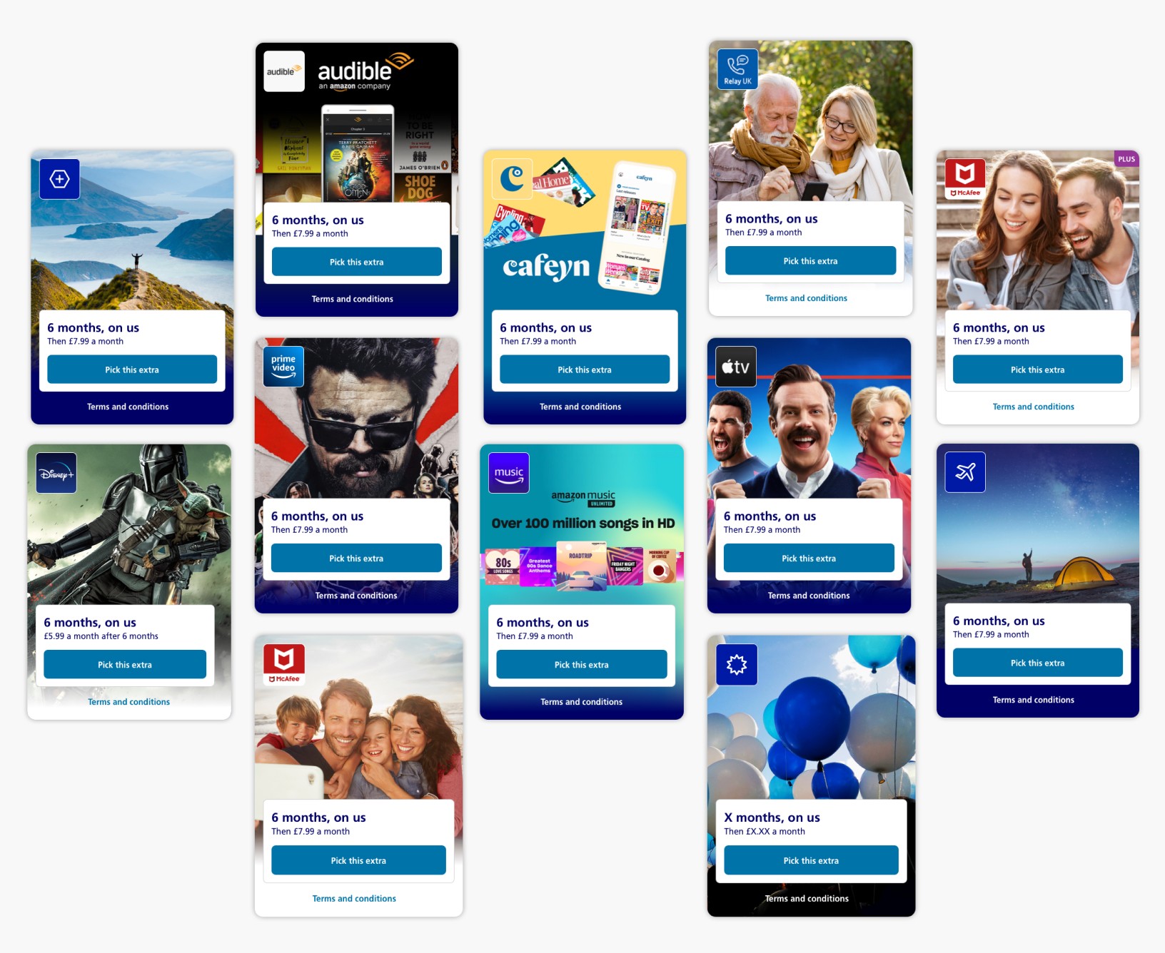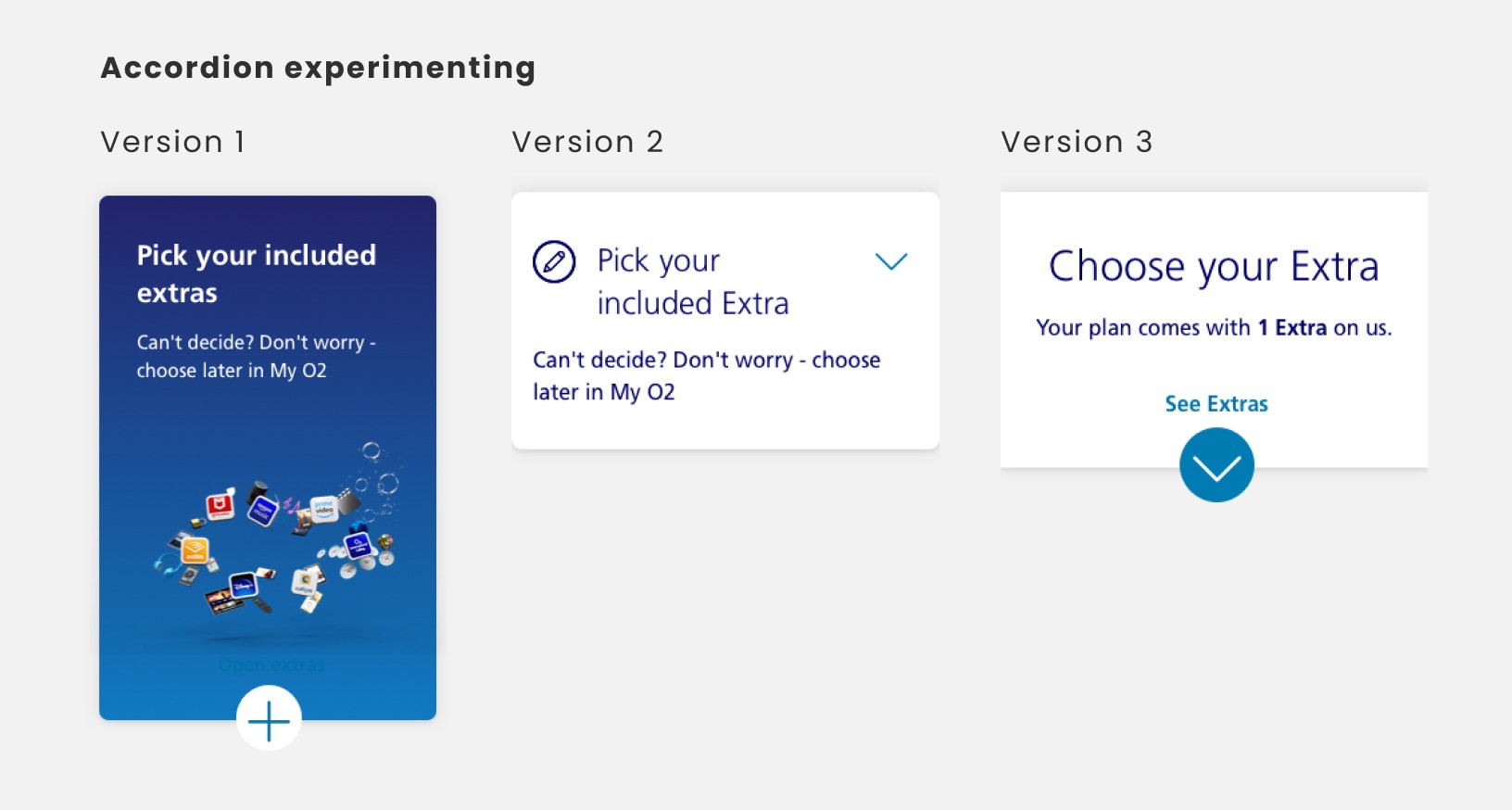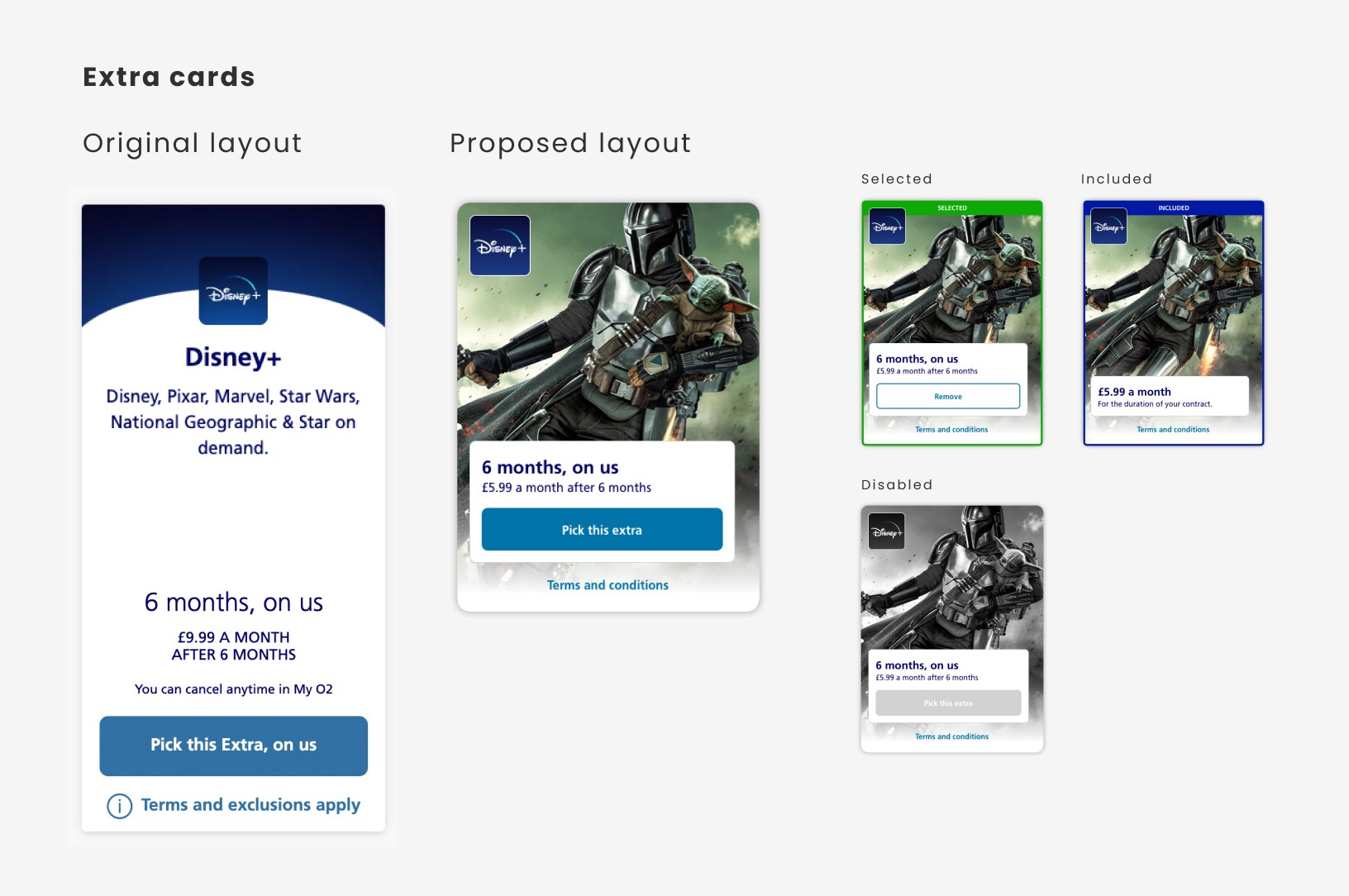 The Extras section was another key pain point, cards were overly tall and cluttered. UX feedback indicated that long explanatory copy was confusing and unnecessary.
