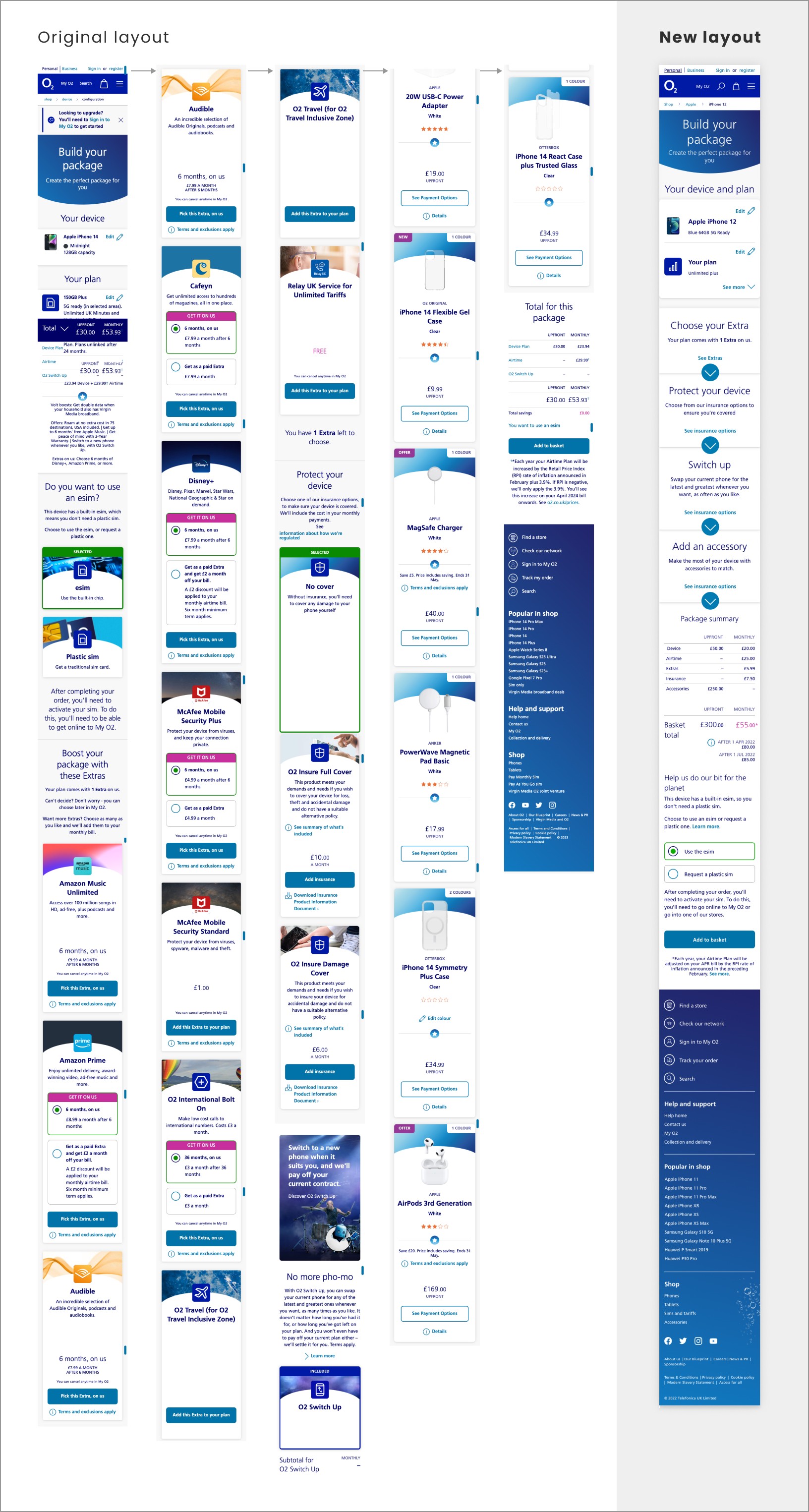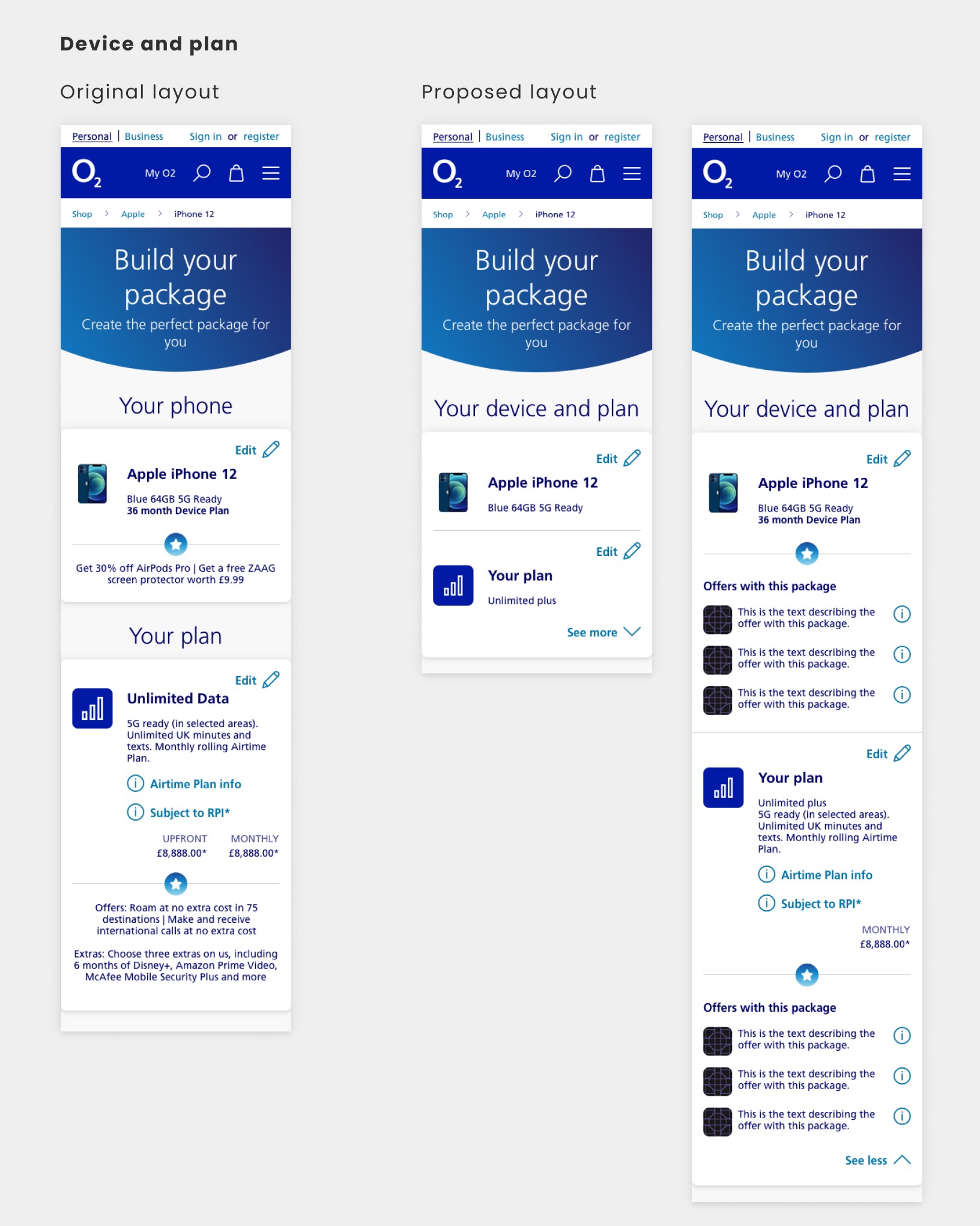 Previously, the Device and Airtime plans were presented in separate panels, each containing extensive legal content. I merged these into a single, unified component, introducing a dropdown accordion to contain terms and offers. This reduced vertical space significantly while keeping key information easily accessible.