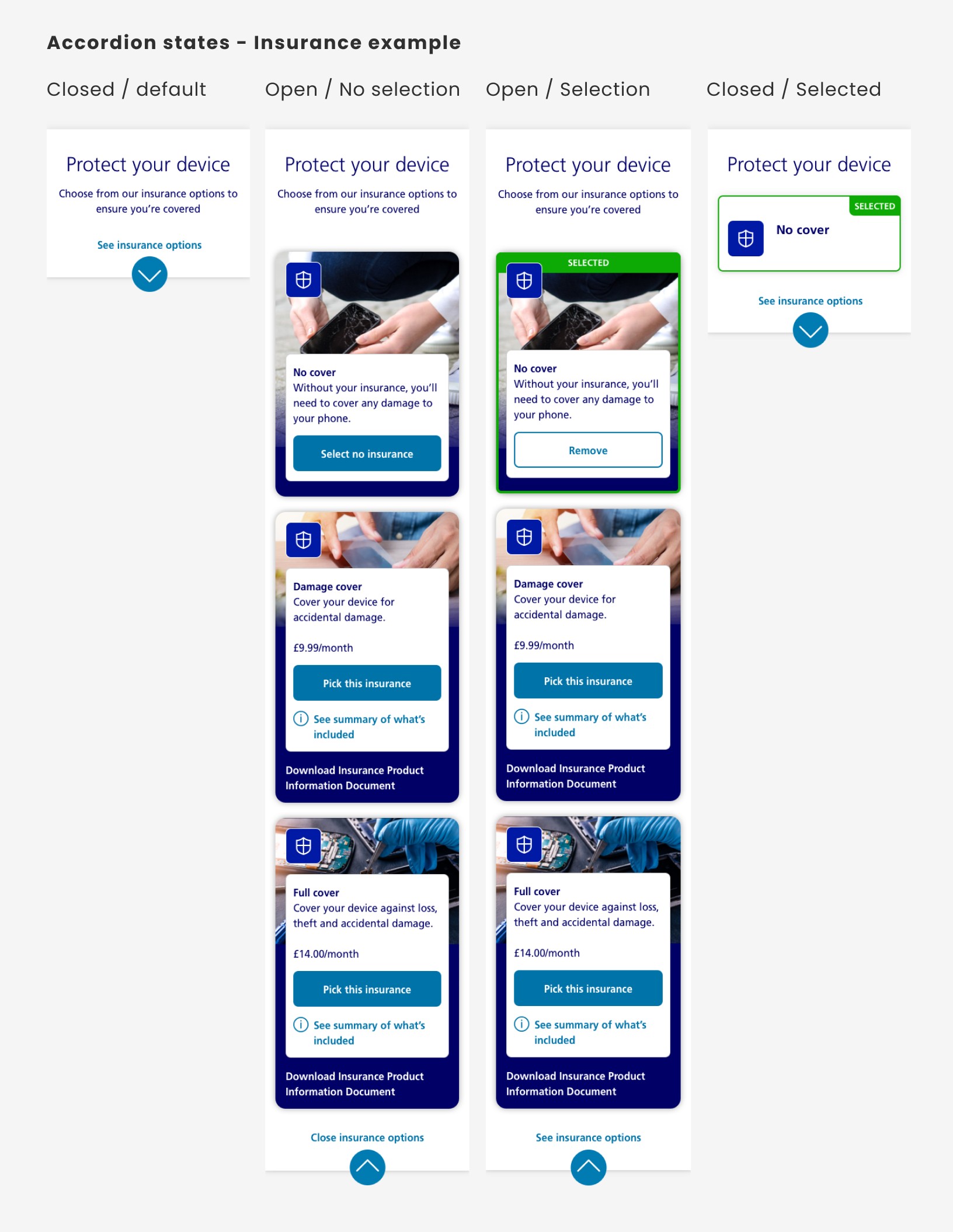 The original accordion “selected state” was presented as plain text, which lacked visual clarity. To align with the design system, I audited existing patterns and created a selected card state consistent with established interaction rules, improving both usability and visual continuity.
