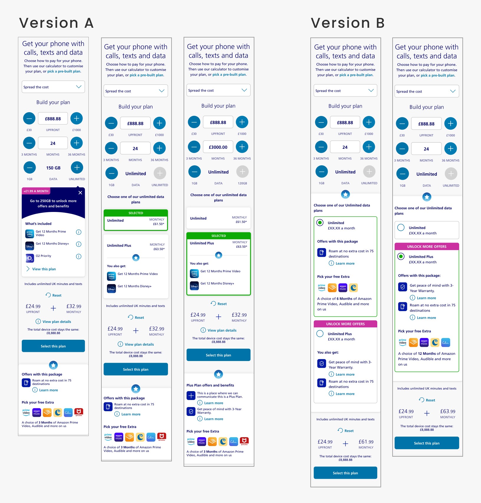 During the A/B test, we compared two designs and found that version A performed better. User testing indicated that when customers chose Unlimited data, they were also presented with the option to select Unlimited Plus. Customers understood that by choosing Unlimited Plus, they would gain access to additional offers. This project was pushed live in March 2023 as an interim solution and is continuing to successfully generate conversion.