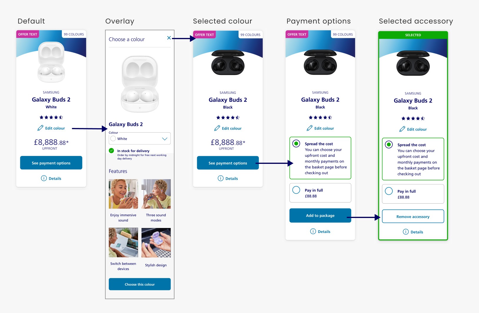 Fix - We streamlined the page by redesigning the accessory tiles and introducing a color editing feature. Additionally, we incorporated product features and stock availability into the overlay for each color option. The improved accessory tiles received positive feedback from senior stakeholders and are now ready for implementation.